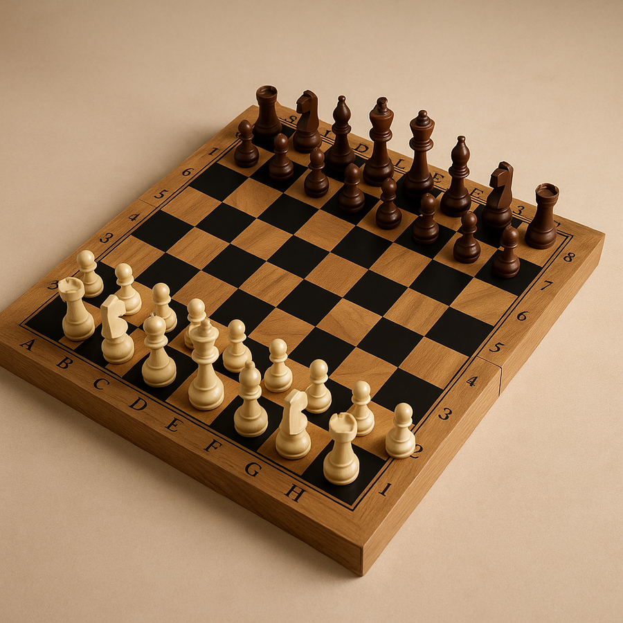 قطع شطرنج كاملة : ملك، ملكة، 2 قلعة، 2 فيل، 2 حصان، و8 بيادق باللون الكريمي والبني الداكن